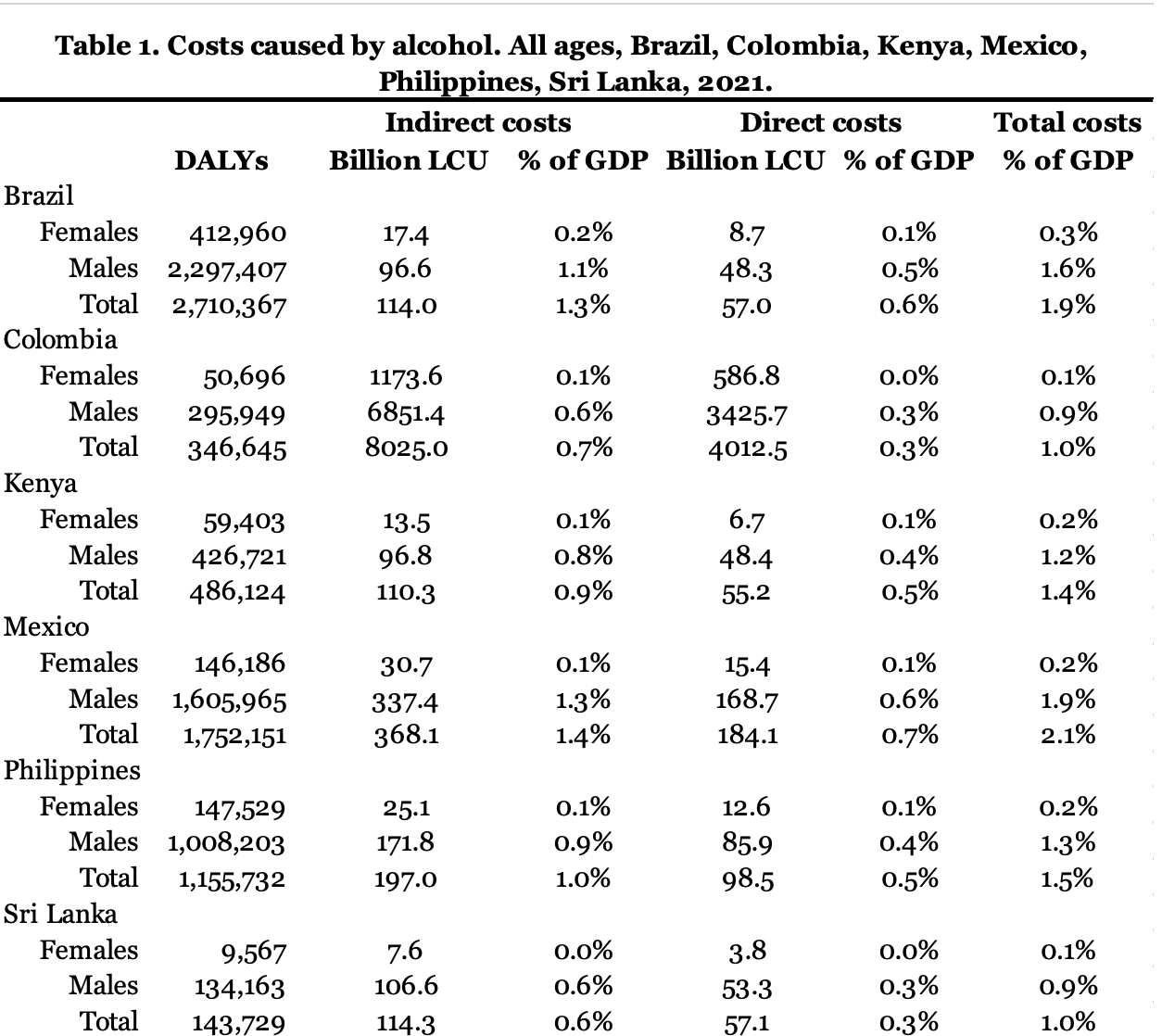 - Estimated the substantial economic costs of alcohol consumption in Brazil, Colombia, Kenya, Mexico, Philippines, and Sri Lanka.
